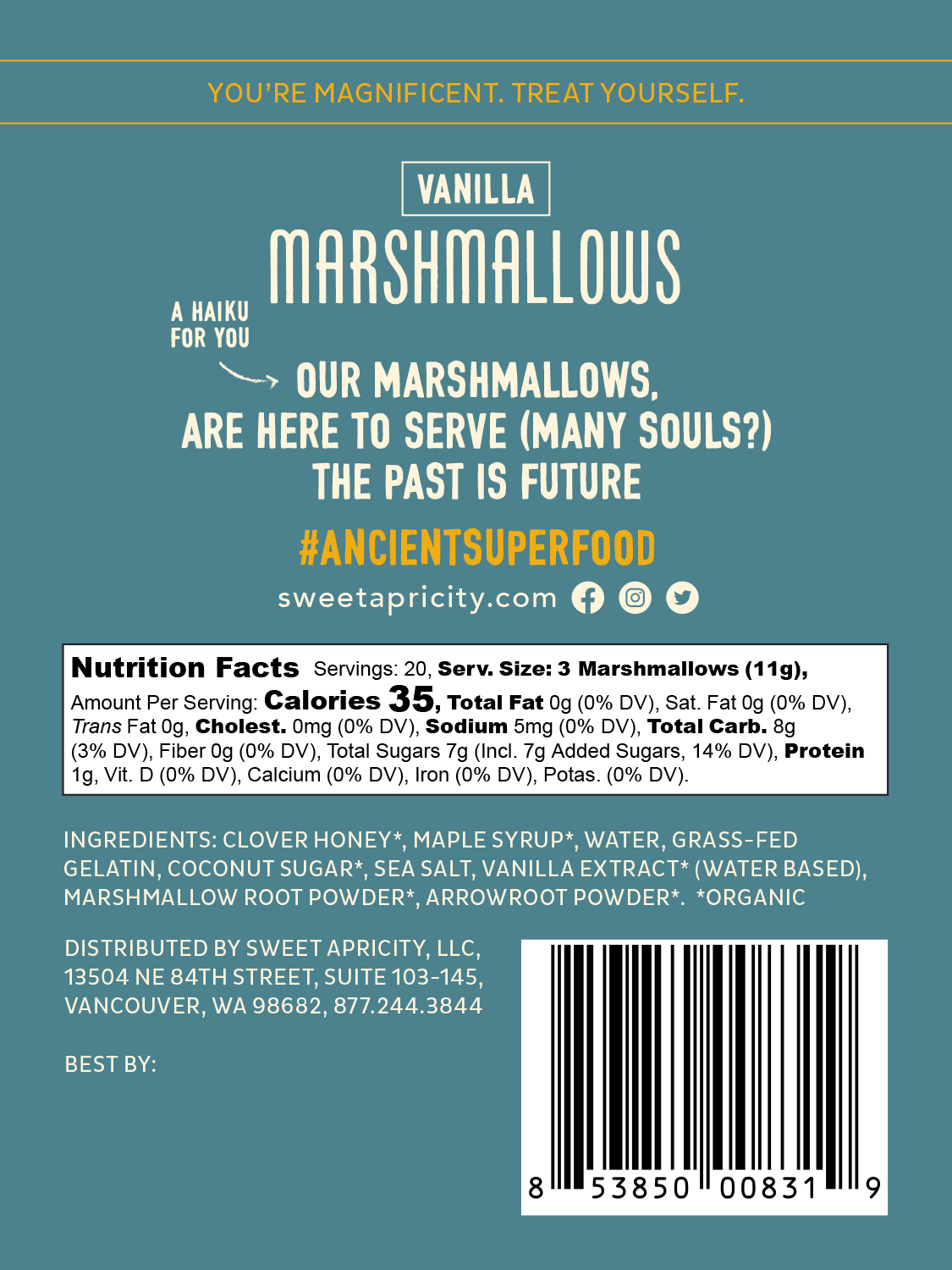 Ingredients: Organic Honey, Water, Organic Maple Sugar, Organic Coconut Sugar, Grass Fed Beef Gelatin, Sea Salt, Vanilla Extract (Water-Based), Organic Marshmallow Root Powder, Organic Arrowroot Powder